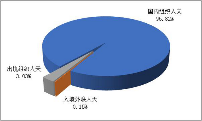 按照國內(nèi)組織人天、入境外聯(lián)人天、出境組織人天三項指標,國內(nèi)旅游、入境旅游、出境旅游市場人天所占份額依次為96.82%、0.15%、3.03%。(見圖7)