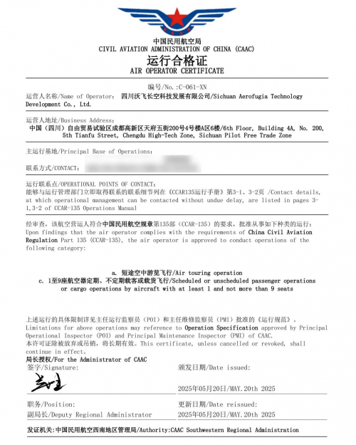 是中國民用航空局(CAAC)依據 CCAR-135部批準航空運營人從事特定航空運行種類的行政許可證書,是民用航空企業(yè)能夠商業(yè)運行的必需許可,也是保障乘客安全的基礎。