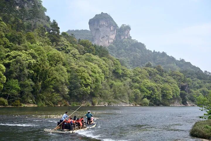 游客在武夷山國(guó)家公園九曲溪乘竹筏游覽(2021年3月22日攝)。
