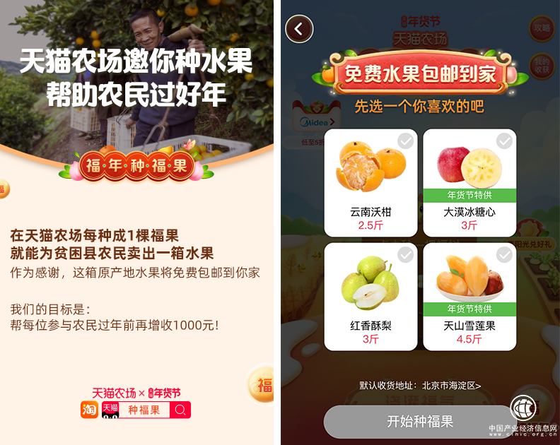 第二份禮,是“開心”。今天,“福年種福果”活動正式上線。用戶登錄天貓農(nóng)場,就可化身“農(nóng)場主”,跟農(nóng)民“一起種水果”。每種成一棵果樹,將免費換得一箱“基地直供”的高品質(zhì)水果。據(jù)了解,阿里在全國落地的1000個數(shù)字基地,大部分位于貧困地區(qū)。