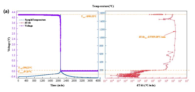 圖2 三元九系電池熱失控(a)溫度&電壓-時間曲線、溫升速率-溫度曲線和(b)附加熱電偶溫度-時間曲線
