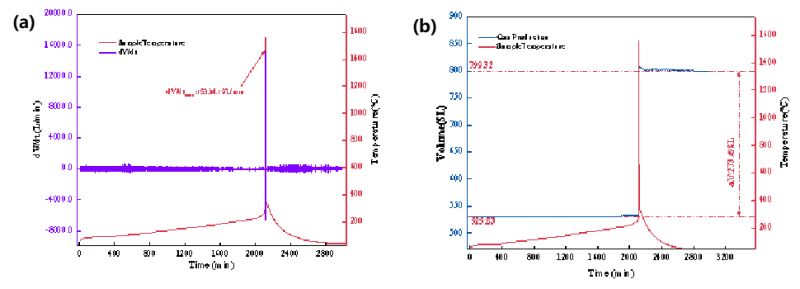 圖3 三元九系電池熱失控(a)產(chǎn)氣速率曲線及(b)產(chǎn)氣量曲線
