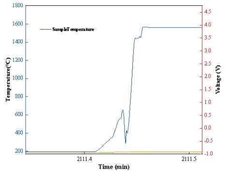 對圖2溫度數(shù)據(jù)及圖3產(chǎn)氣速率、產(chǎn)氣量數(shù)據(jù)進行分析后發(fā)現(xiàn),該電池熱失控十分劇烈,并且放大樣品溫度曲線可以發(fā)現(xiàn),整個熱失控過程從開始到結(jié)束持續(xù)不到3s,就完成了1300℃以上的溫升,溫升速率達到了200000℃/min以上。同時,觀察氣體數(shù)據(jù)可以發(fā)現(xiàn),在熱失控過程中最大產(chǎn)氣速率達到15000L/min以上,展現(xiàn)了鋰電池燃爆時極強的沖擊力。
