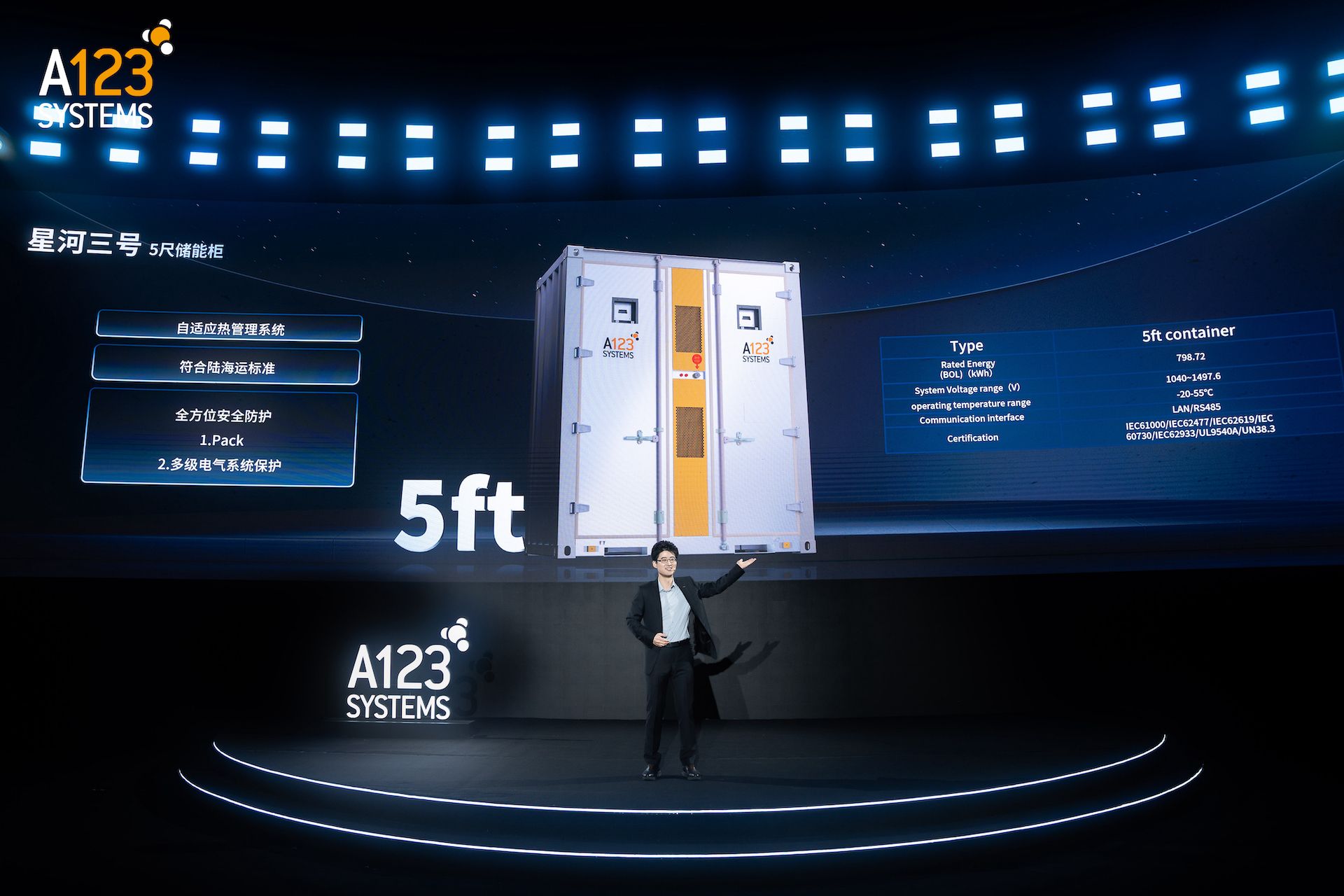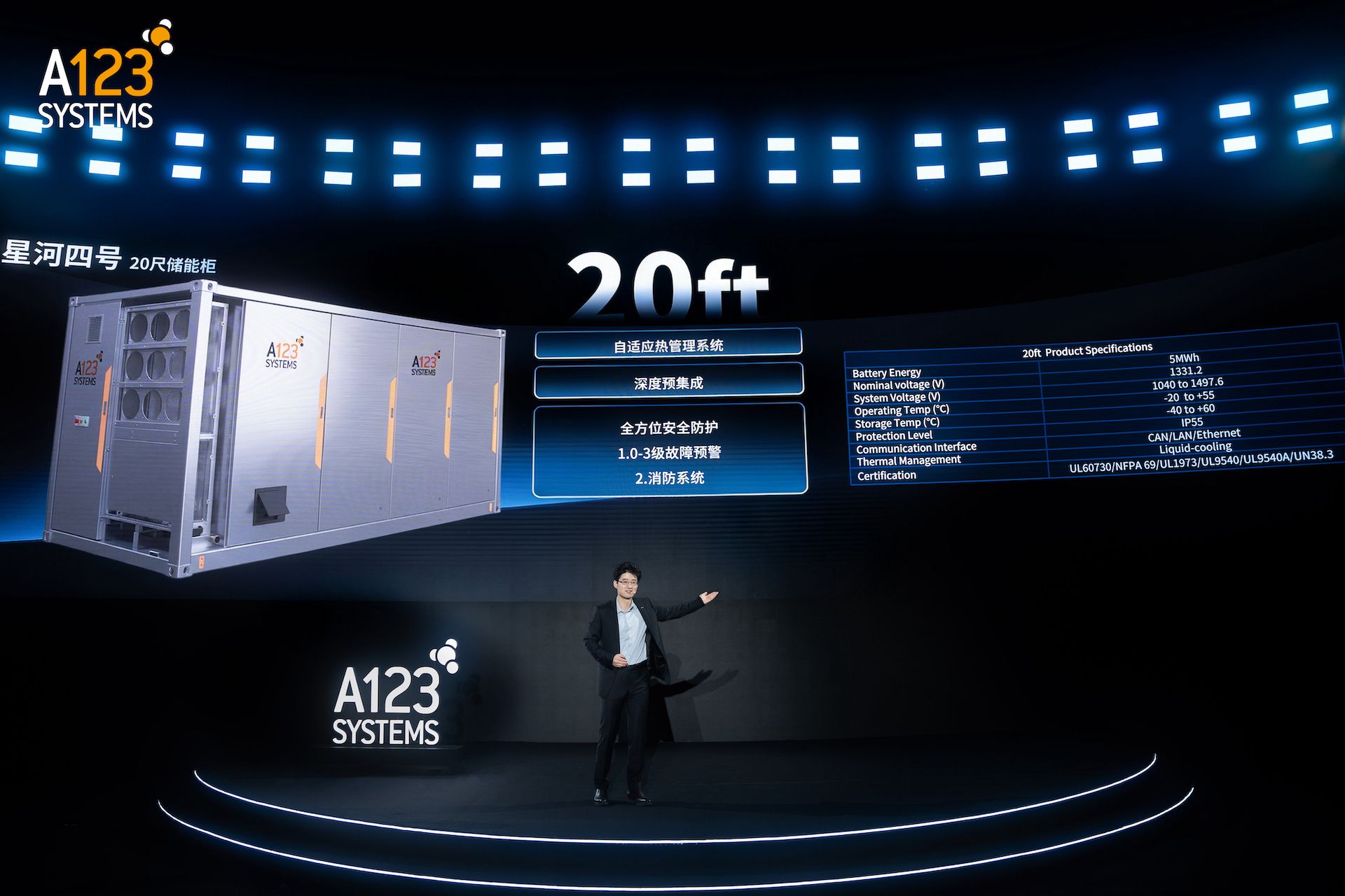 依托半固態(tài)浸沒式技術平臺,A123構建了精準適配四大核心場景的“星河系列”產(chǎn)品矩陣。針對高能耗的數(shù)據(jù)中心,星河系列HVDC儲能產(chǎn)品采用800V高壓直流架構,單機柜功率達12–24kW,系統(tǒng)效率提升4%,具備替代傳統(tǒng)UPS作為主供電源的能力,真正實現(xiàn)了“儲能即主供”。面向戶外嚴苛環(huán)境,星河系列戶外柜儲能具備IP68頂級防護及-30℃至60℃寬溫域運行能力,精準適配充電站及零碳園區(qū)。針對海島、油田等高難度離岸場景,引入模塊化5HC標準的星河系列5ft集裝箱儲能,運輸重量減輕20%,支持現(xiàn)場自由堆疊且支持海運免拆機;而星河系列20ft集裝箱儲能則配備三級BMS管理與“氣凝膠+水噴霧”多級消防系統(tǒng),結合0級鎖機功能,打造出堅不可摧的安全防線。