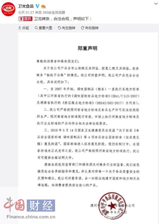 今日凌晨,衛(wèi)龍食品在微博上對此作出回應(yīng),稱衛(wèi)龍產(chǎn)品完全合法合規(guī)。