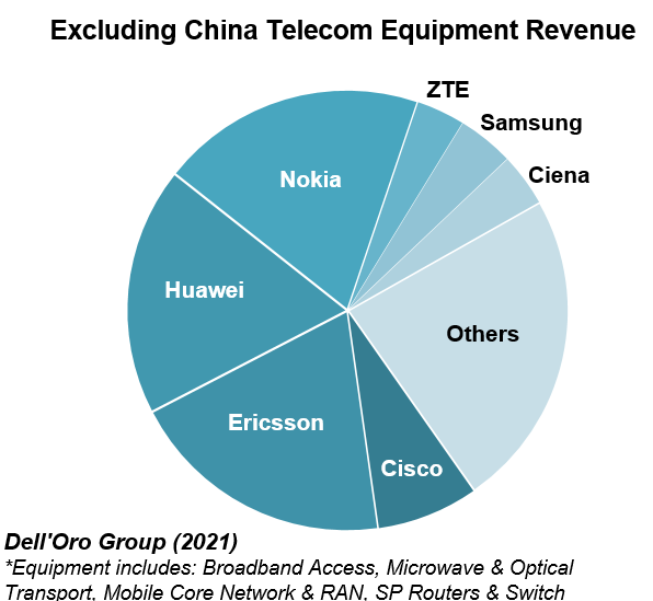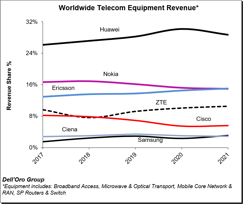 美國政府為遏制使用華為設(shè)備的持續(xù)行動正在影響該公司在中國以外的市場地位。即使如此,華為仍在全球市場保持領(lǐng)先地位,這突顯了其對中國市場的掌控、電信產(chǎn)品組合的深度以及該公司對現(xiàn)有業(yè)務(wù)的韌性。