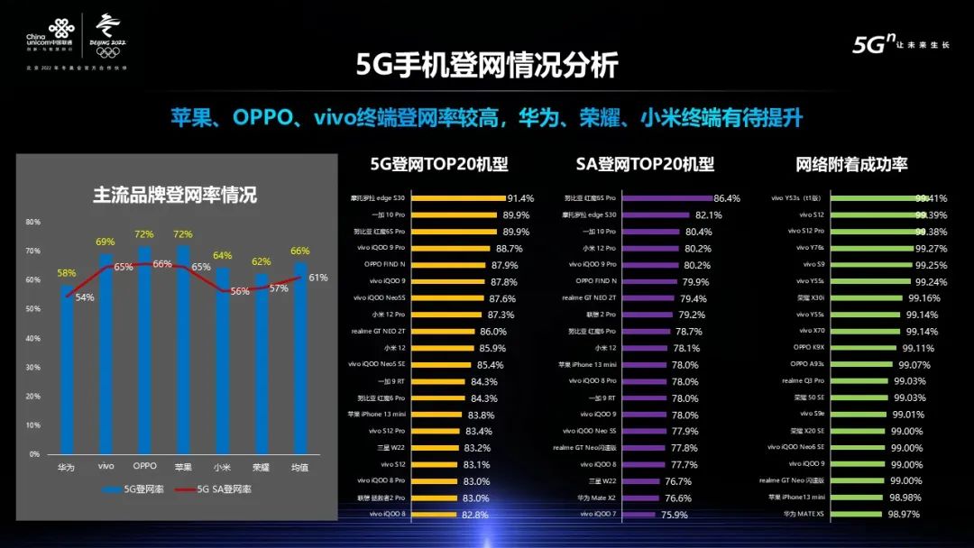5G手機(jī)登網(wǎng)情況分析顯示,蘋果、OPPO、vivo終端登網(wǎng)率較高,分別為72%、72%、69%,華為、榮耀、小米終端登網(wǎng)率分別為58%、62%、64%,有待提升。
