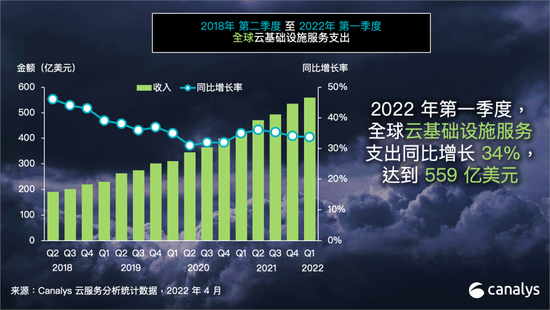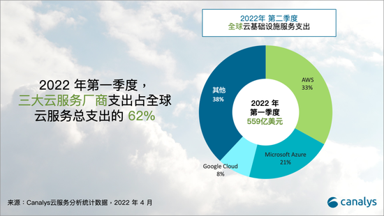 為了應(yīng)對市場的挑戰(zhàn),企業(yè)紛紛將數(shù)字化作為發(fā)展的首要戰(zhàn)略,2022年第一季度,全球云基礎(chǔ)設(shè)施服務(wù)支出同比增長了34%,達(dá)到559億美元。據(jù)Canalys最新數(shù)據(jù)統(tǒng)計,云服務(wù)總體支出較上一季度增加了20億美元,較2021年第一季度增加了140億美元。三大云服務(wù)廠商AWS、Microsoft和Google受益于云計算采用率的增加和使用規(guī)模的擴(kuò)張,其總支出占全球用戶支出的62%,同比增長了42%。