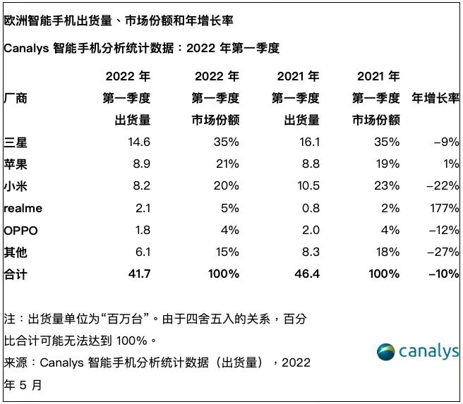 2022年第一季度,歐洲智能手機(jī)市場(chǎng)出貨量排名前五的廠商分別為:三星、蘋果、小米、realme、OPPO。
