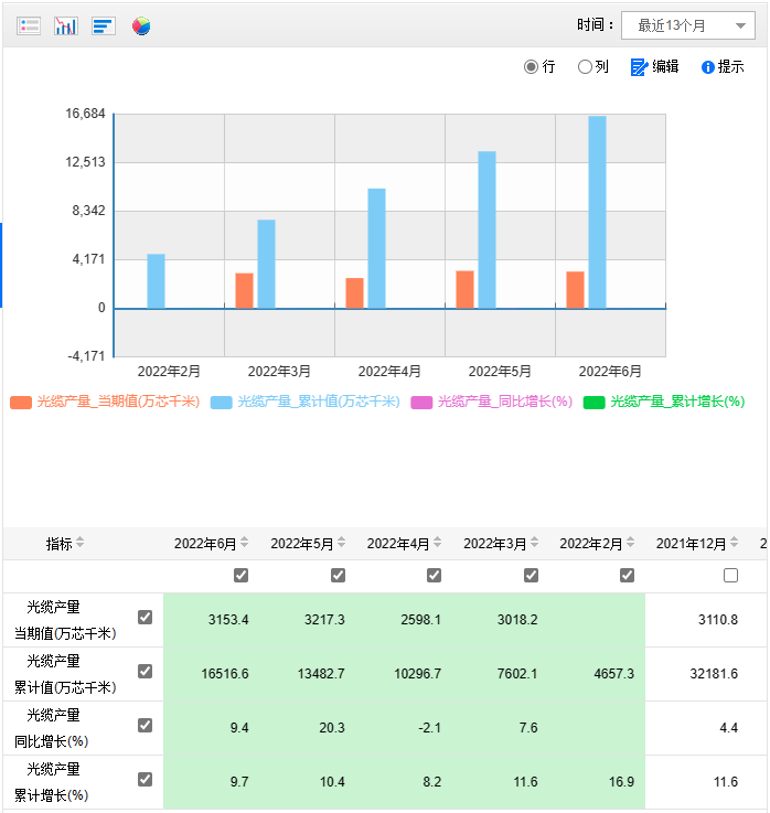 來自國家統(tǒng)計局數(shù)據(jù)顯示,2022年上半年,國內(nèi)光纜產(chǎn)量累計值達到1.65億芯千米,光纜產(chǎn)量累計增長9.7%。