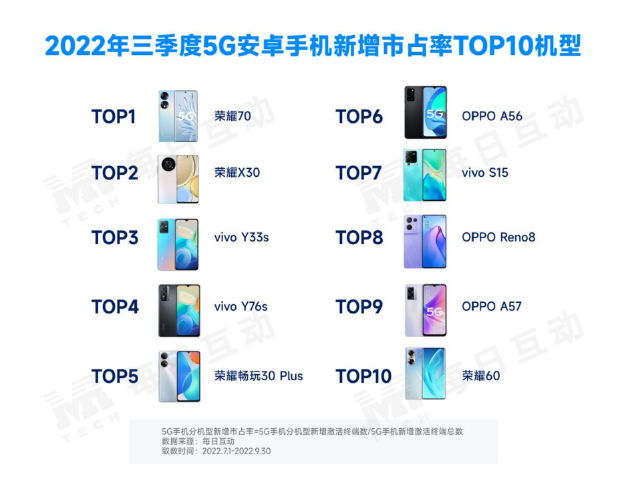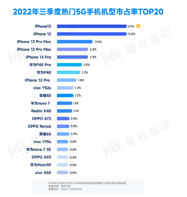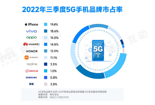 數(shù)據(jù)智能上市企業(yè)每日互動(股票代碼300766)大數(shù)據(jù)持續(xù)洞察5G手機市場新變化,并發(fā)布《2022年三季度5G手機報告》。報告顯示,國內(nèi)5G手機市場依舊穩(wěn)步擴大,市占率達37.9%。其中,iPhone 5G手機整體表現(xiàn)突出,榮耀5G手機成為三季度安卓5G手機熱賣榜大贏家,華為經(jīng)典機型仍然具備強勁活力。