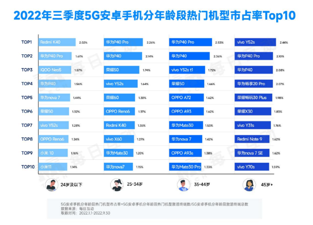 從分年齡段熱門5G安卓手機機型分布情況看,華為P40系列均在各年齡段熱門機型TOP5之列,堪稱經(jīng)典中的經(jīng)典。小米以及vivo旗下子品牌iQOO更受24歲及以下年輕人的喜歡。