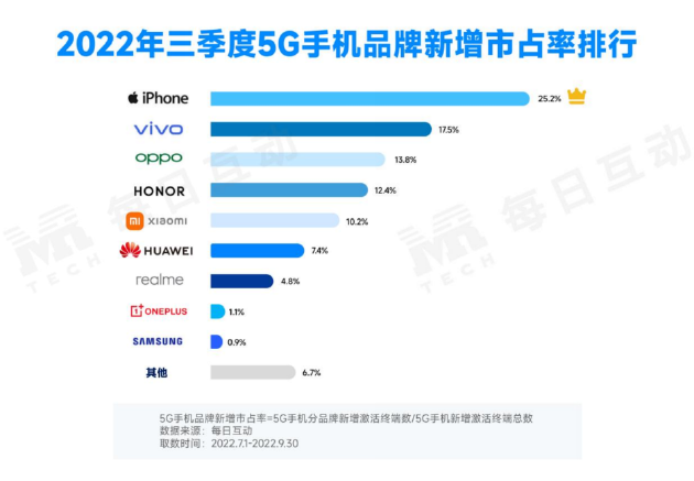 每日互動大數(shù)據(jù)顯示,iPhone 5G手機以19.4%的市占率,領(lǐng)跑市場;vivo 5G手機市占率為18.6%,排名第二,市占率小幅落后于第一位;OPPO 5G手機排名第三,市占率達15.0%;華為 5G手機雖然“斷更”,但其市占率依然有14.8%,排名第四;榮耀5G手機市占率為12.0%,排名第五;小米5G手機市占率達11.1%,排名第六。