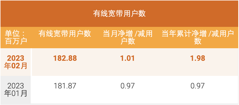 有線寬帶業(yè)務(wù)方面,當(dāng)月中國電信有線寬帶用戶數(shù)凈增101萬戶,有線寬帶累計(jì)用戶數(shù)1.8288億戶。固定電話業(yè)務(wù)方面,當(dāng)月中國電信固定電話用戶數(shù)凈減36萬戶,固定電話累計(jì)用戶數(shù)1.0434億戶。