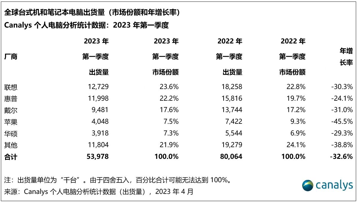 2023年第一季度,全球個(gè)人電腦市場(chǎng)(臺(tái)式機(jī)和筆記本電腦)出貨量排名前五的廠商分別為:聯(lián)想、惠普、戴爾、蘋果、華碩。其中,聯(lián)想的市場(chǎng)份額接近24%位居榜首,但卻遭遇了30%的大幅年度下滑;惠普位列第二,經(jīng)歷了24%的較大幅度下降;戴爾排名第三,同比下降31%,自2018年第一季度以來(lái)首次跌破1000萬(wàn)臺(tái)大關(guān);蘋果排名第四,出貨量下降了近46%;華碩第五,出貨量同比下降29.3%。
