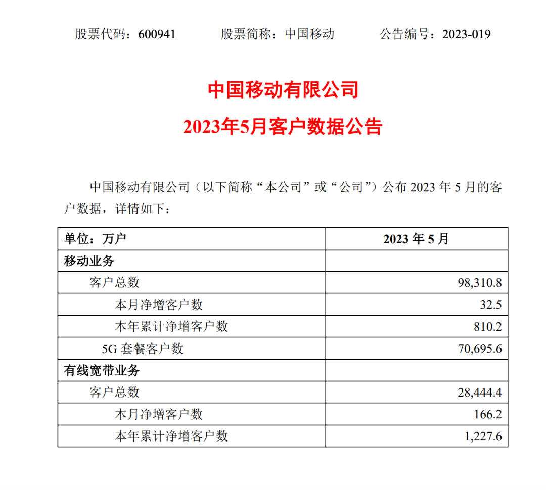 中國移動今日公布2023年5月份運營數(shù)據(jù),當月,中國移動移動客戶數(shù)凈增32.5萬戶,用戶總數(shù)達到9.83108億戶。