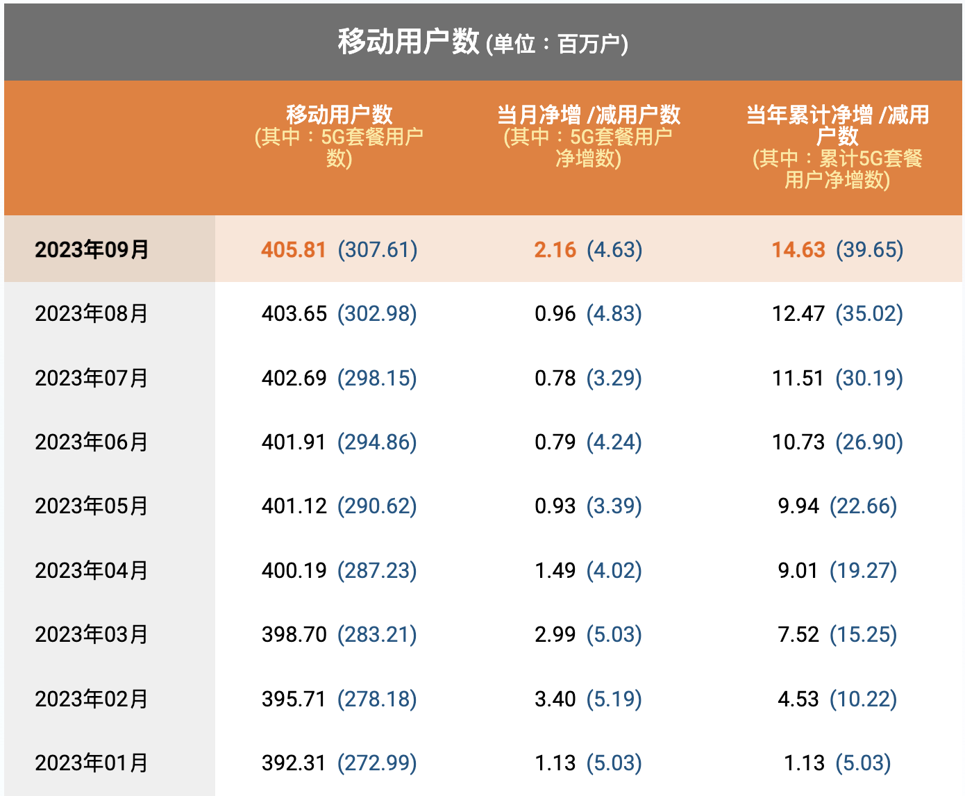 10月20日,中國電信公布了2023年9月主要運(yùn)營數(shù)據(jù)。當(dāng)月,中國電信移動用戶數(shù)凈增216萬戶,移動用戶數(shù)累計4.0581億戶。其中,5G套餐用戶凈增463萬戶,5G套餐用戶數(shù)累計3.0761億戶。