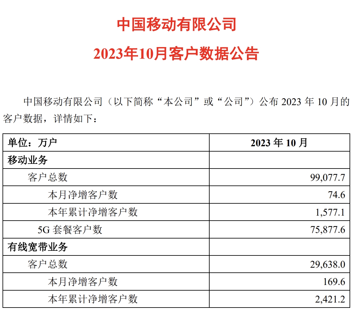 中國(guó)移動(dòng)近日公布2023年10月份運(yùn)營(yíng)數(shù)據(jù),當(dāng)月,中國(guó)移動(dòng)移動(dòng)客戶數(shù)凈增74.6萬(wàn)戶,用戶總數(shù)達(dá)到9.90777億戶。