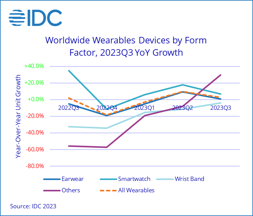 據(jù)IDC最新數(shù)據(jù),2023年第三季度全球可穿戴設備出貨量同比增長2.6%,達到1.484億件的歷史最高水平。這種增長在很大程度上歸功于小品牌和新興品類的崛起。