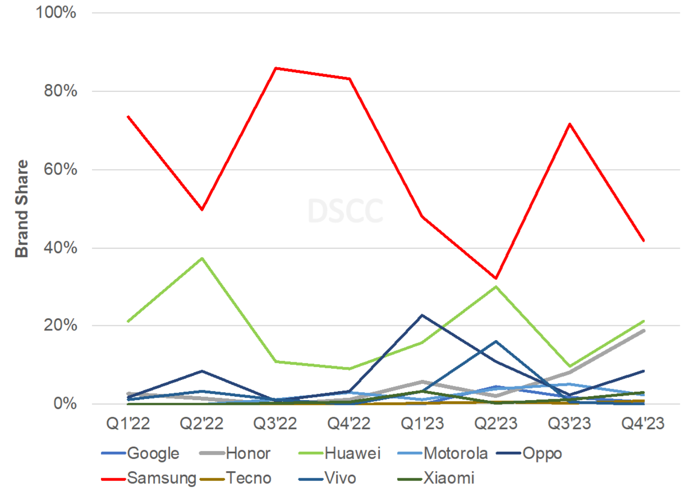 市場份額方面,三星該季度的市場份額達到 72% 位居第一,但低于去年的 86%,這是因為競爭對手陸續(xù)推出更多機型,并追求更高銷量。華為和榮耀則分別位居亞軍、季軍,前者份額為 9%,后者份額為 8%。
