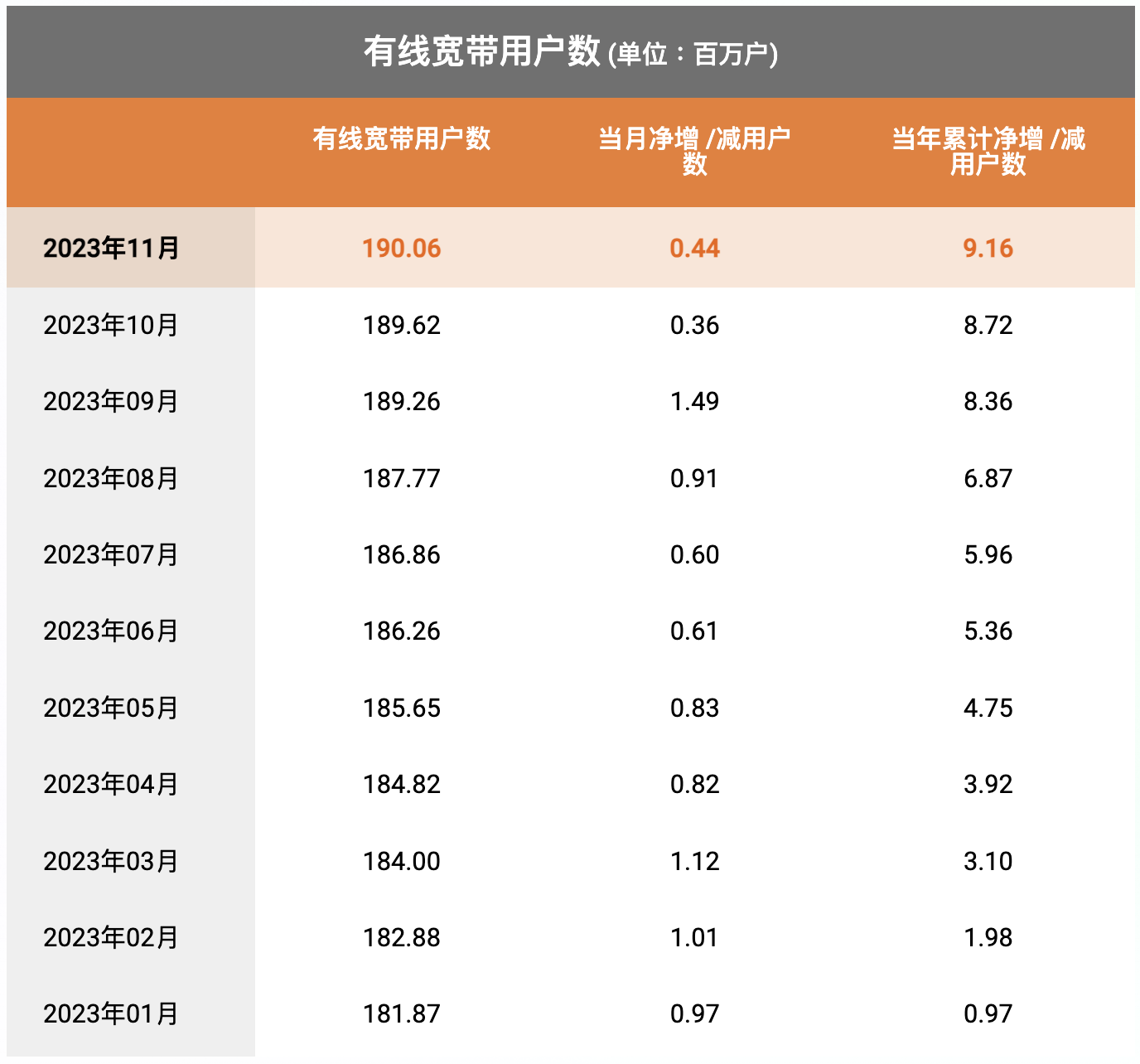 有線寬帶業(yè)務(wù)方面,當(dāng)月中國(guó)電信有線寬帶用戶數(shù)凈增44萬戶,有線寬帶累計(jì)用戶數(shù)1.9006億戶。固定電話業(yè)務(wù)方面,當(dāng)月中國(guó)電信固定電話用戶數(shù)凈減41萬戶,固定電話累計(jì)用戶數(shù)1.0133億戶。