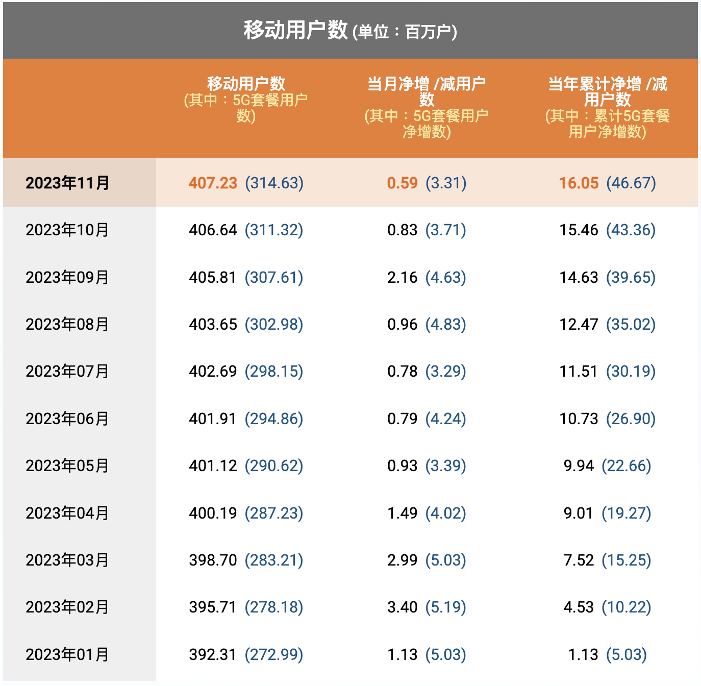 近日,中國(guó)電信公布了2023年11月主要運(yùn)營(yíng)數(shù)據(jù)。當(dāng)月,中國(guó)電信移動(dòng)用戶數(shù)凈增59萬戶,移動(dòng)用戶數(shù)累計(jì)4.0723億戶。其中,5G套餐用戶凈增331萬戶,5G套餐用戶數(shù)累計(jì)3.1463億戶。