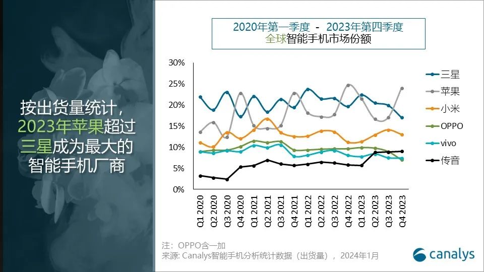 2023年全年,全球智能手機(jī)總出貨量為11億部,同比下降4%。蘋果首次略超三星,成為2023年度出貨量最高的廠商,不過兩者的市場份額均為20%。小米、OPPO和傳音分別占據(jù)13%、9%和8%的市場份額。
