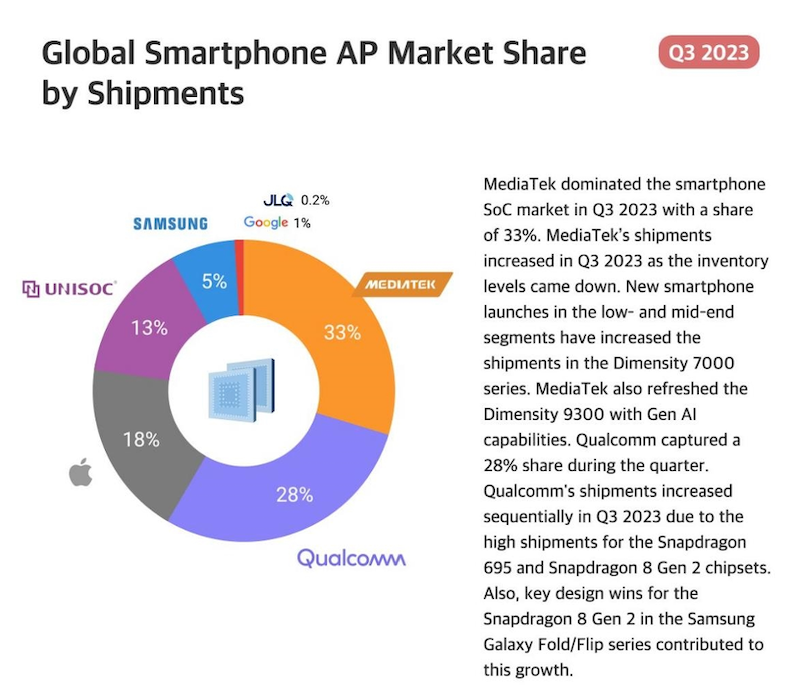 2023年第三季度智能手機AP市場出貨份額