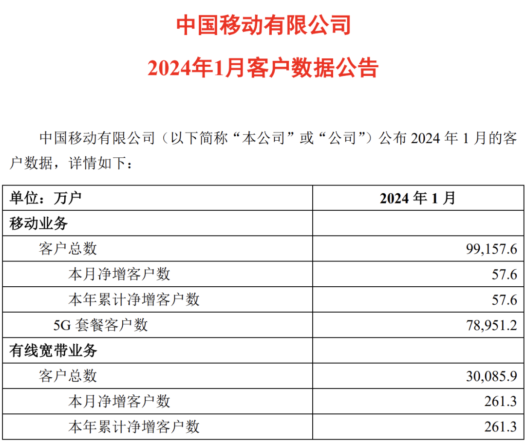 中國移動近日公布2024年1月份運營數(shù)據(jù),當(dāng)月,中國移動移動客戶數(shù)凈增57.6萬戶,用戶總數(shù)達(dá)到9.916億戶。
