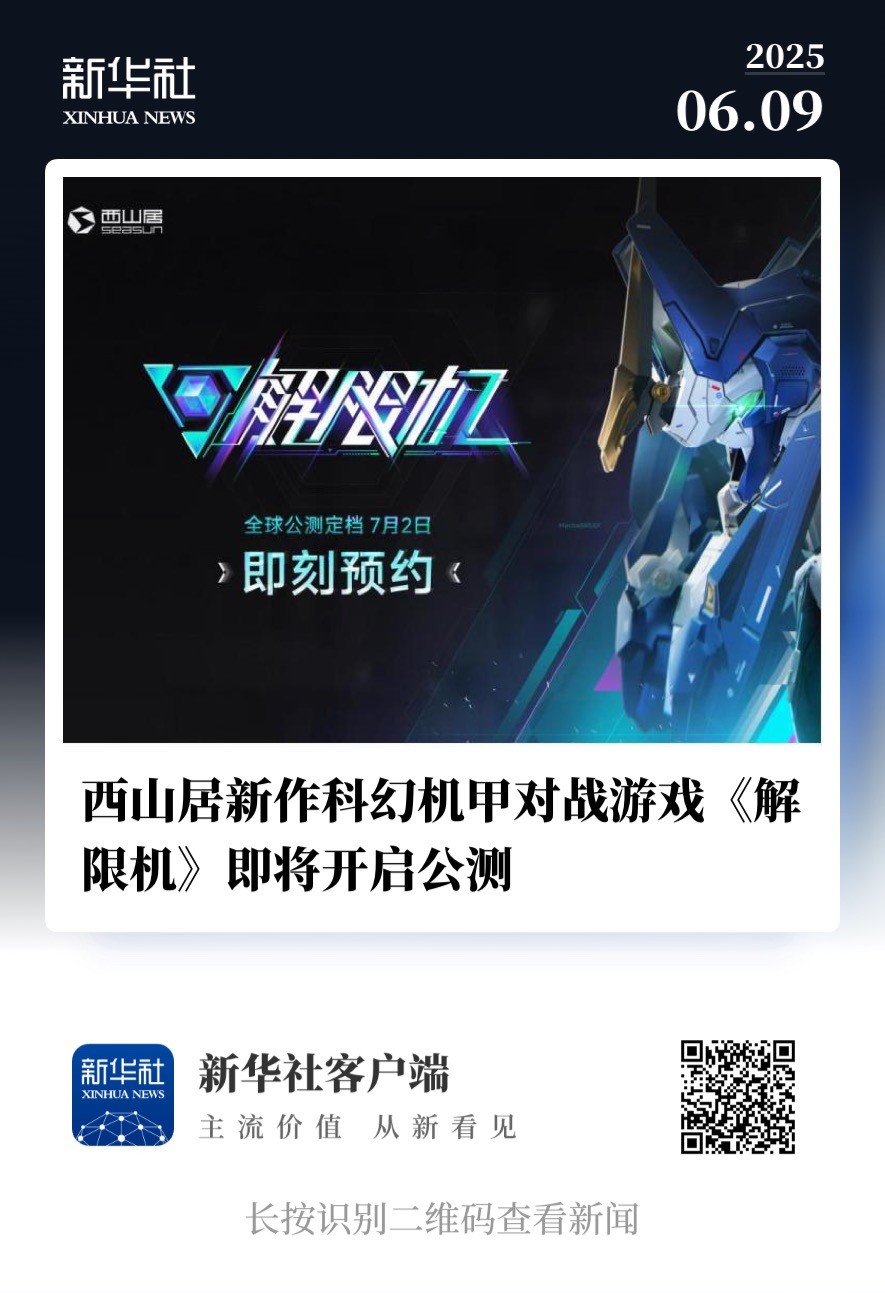 這款重量級新作的動向也引起了新華社的關(guān)注,并于今日發(fā)文報道《解限機》于全球知名電子游戲展會“夏日游戲節(jié)”上正式揭曉公測日期——2025年7月2日。制作人郭煒煒將于6月9日晚進行全球直播,詳細(xì)介紹游戲優(yōu)化與更新內(nèi)容。