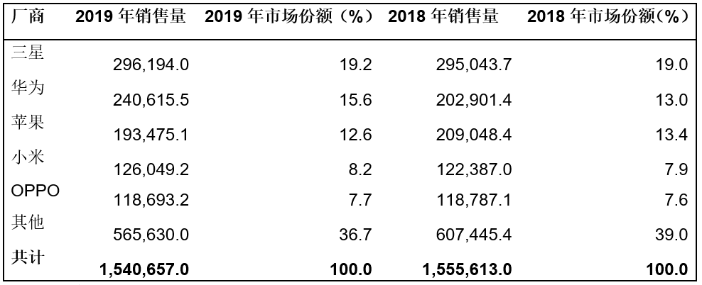 表二、2019年全球各廠商售給終端用戶的智能手機(jī)數(shù)量(單位:千部)