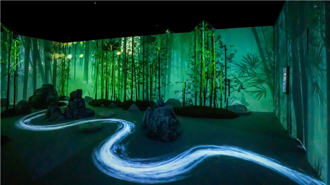 在展覽中,觀眾可以直觀地欣賞到數(shù)字技術(shù)如何使傳統(tǒng)紋樣煥發(fā)新生。展館中庭區(qū)域以裸眼3D形式新生的數(shù)字文物全方位展現(xiàn)了紋樣的靈動之美;脫胎于自然的蓮花、鷺鷥、枇杷、鯉魚等紋樣在數(shù)字化光影中重發(fā)煥彩,古人對自然與生活的細致觀察與豐富想象在“‘紋’法自然”展區(qū)得以具象化;在“紋窗弄影”展區(qū),觀眾可穿梭在宮墻間,感受三交六菀菱花窗影旁的故宮四季;在“流光溢彩”展區(qū),動態(tài)光影的流動交織賦予了云龍紋、海水龍紋、纏枝蓮紋、蝠桃紋蓬勃的生命力與無盡延展的空間感,觀眾仿佛步入由紋樣構(gòu)建的瑰麗夢境;“錦繡世界”展區(qū)以萬花筒形式呈現(xiàn)了乾隆款畫琺瑯團錦花紋蓋罐等器物上豐富多彩的紋樣組合,把傳統(tǒng)紋樣化作絢麗多變的視覺奇觀;“夢幻江南”則利用虛擬現(xiàn)實技術(shù)生動還原了故宮倦勤齋的室內(nèi)戲臺區(qū)域,帶領(lǐng)觀眾進入乾隆皇帝對于江南的遐想空間。