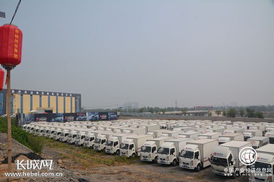 移聯網信集團首批采購的2000輛東風新能源電動物流車整裝待發(fā)。 記者 吳新光 攝