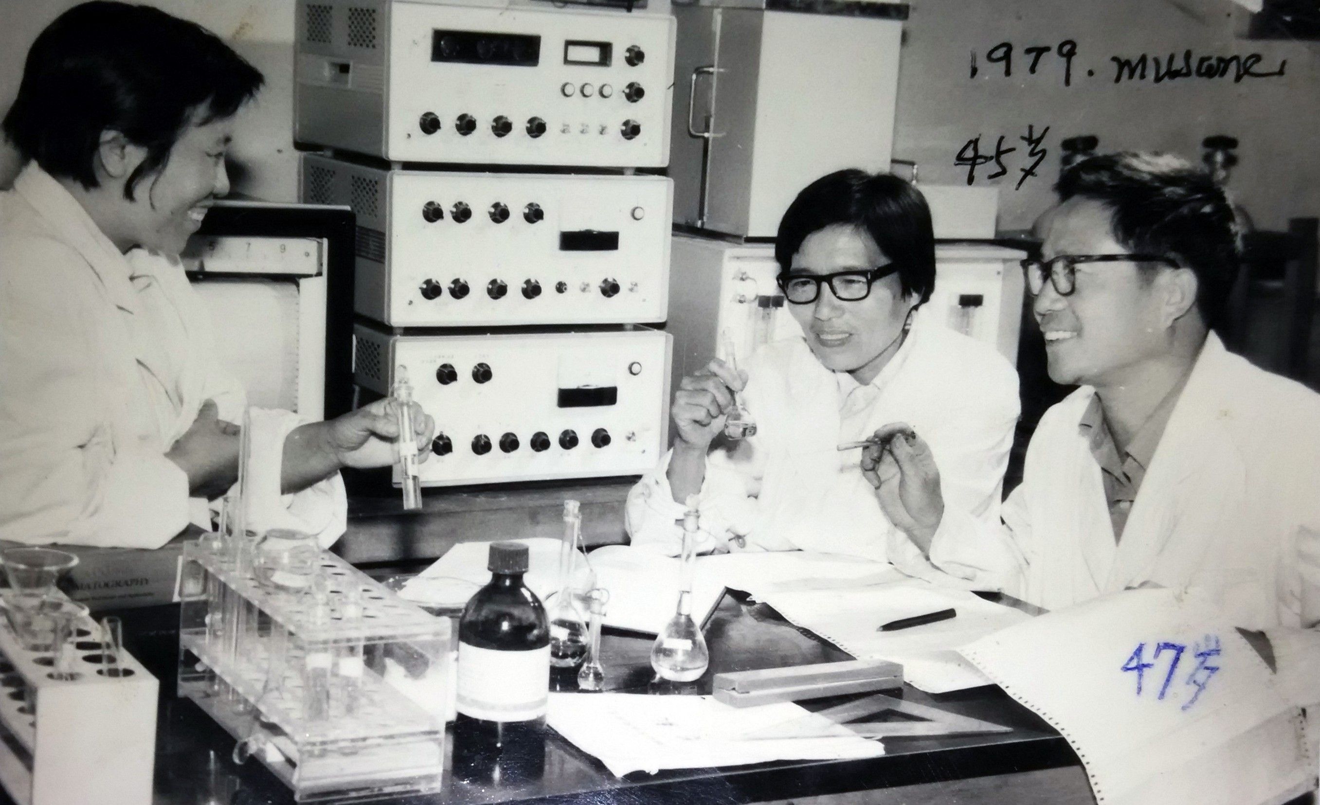 圖:1979年,麝香酮用氣相色譜法證實異構(gòu)體已分離,得到純度99.8%麝香酮判定結(jié)果后,成員們的喜悅。