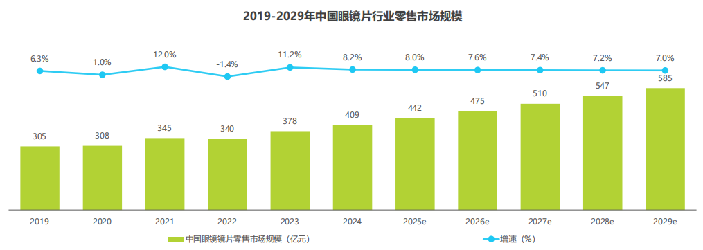 鏡片作為實現(xiàn)眼鏡功能的核心部件,根據(jù)艾瑞咨詢測算,2024年鏡片市場零售規(guī)模約409億元,占整體眼鏡零售市場的44%,預計2029年可達585億元,年平均復合年增長率將穩(wěn)定在6%~8%,市場穩(wěn)步擴張。