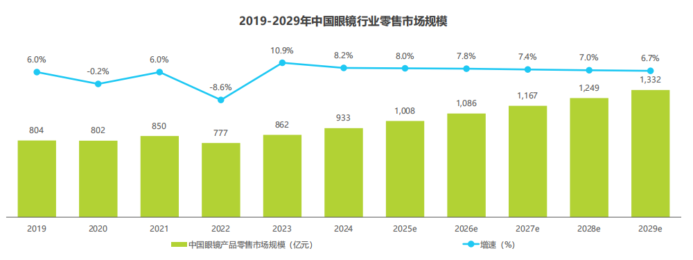 白皮書報告指出,2024年中國眼鏡零售市場規(guī)模約933億元,同比增長約8.2%。2025年,預計將突破1000億元大關(guān),到2029年有望達到1332億元,復合年增長率約7.4%,中國眼鏡行業(yè)整體規(guī)模,呈現(xiàn)持續(xù)增長之勢。