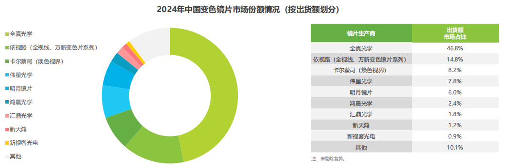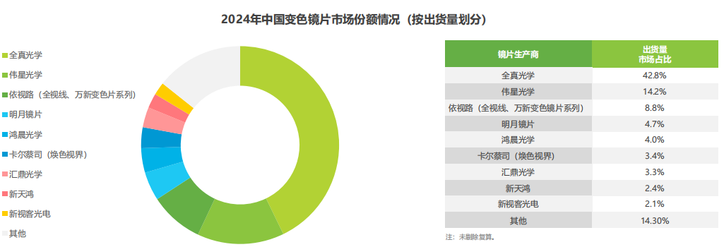 從出貨量看,全真光學依然以42.8%的占比位居第一,這意味著市場上平均每售出10片變色鏡片,約有4片來自全真光學,顯示其巨大的市場鋪貨量,在變色鏡片市場具備明顯的主導優(yōu)勢。