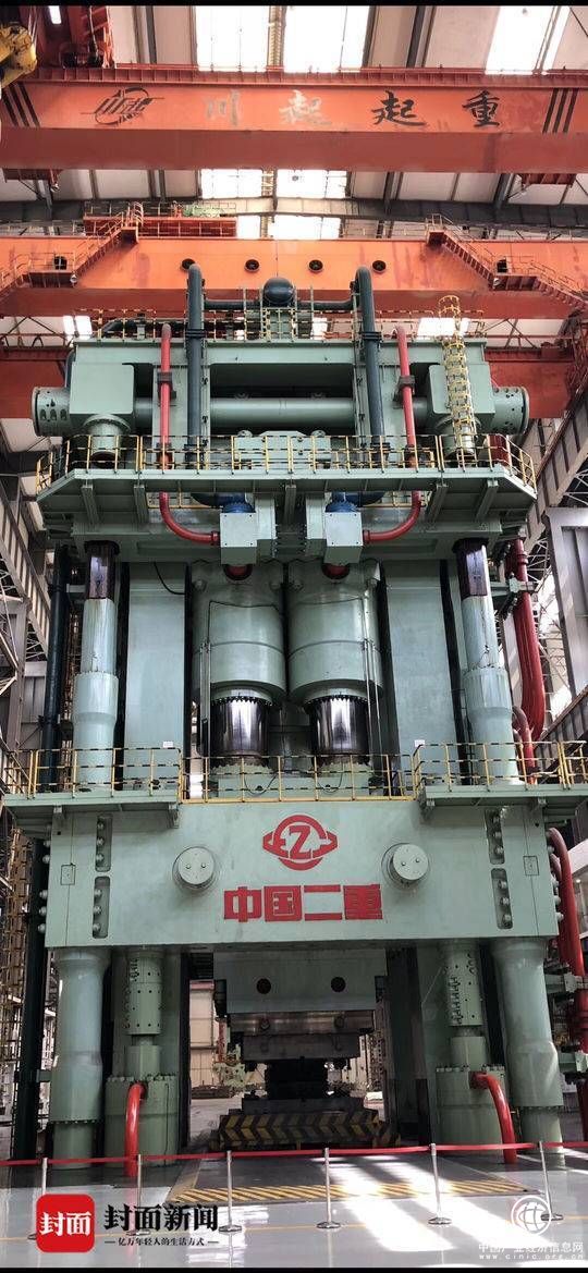 這臺8萬噸級模鍛液壓機被“二重人”介紹為世界最大的“打鐵匠”,它是由我國自主設(shè)計研制的世界最大模鍛液壓機,于2013年4月10日投入試生產(chǎn),填補了我國大型模鍛壓機制造和裝備的空白。該設(shè)備地上高27米、地下15米,總高42米,設(shè)備總重2.2萬噸,僅單個零件超過75噸的就有68個。