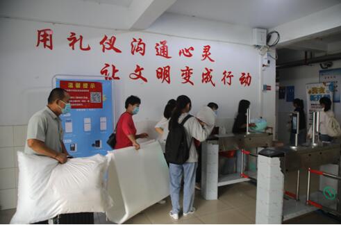 上午8點開始,校門前開始熱鬧起來,學生和家長陸續(xù)來到學校報到。工作人員認真做好入校檢測和秩序維護,新生有序入校;校園內專門設置志愿服務點,幫助搬運行李、指引報到流程;為了方便駕車的學生家長入校,學??茖W設計單向車道,家長車輛直接將學生送至辦公樓前廣場的報到點后迅速離校;學校還安排了從辦公樓至學生公寓的擺渡車,全天往返為學生提供服務。