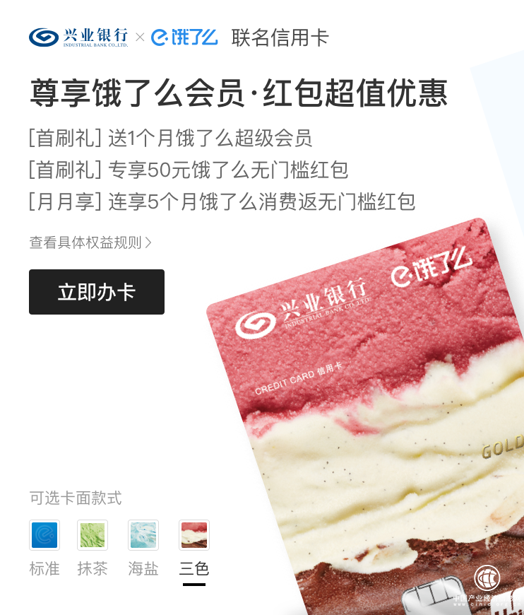據(jù)了解,興業(yè)銀行信用卡新用戶申請(qǐng)興業(yè)銀行餓了么聯(lián)名卡,首刷滿15元,即贈(zèng)1個(gè)月餓了么超級(jí)會(huì)員及五份每個(gè)價(jià)值10元的餓了么紅包,而且自卡片激活當(dāng)月起的5個(gè)月內(nèi),每月只要在餓了么app支付1筆滿15元的交易,次月可獲10元餓了么聯(lián)名會(huì)員專享紅包,最高可達(dá)50元。并且,興業(yè)銀行和餓了么的這張聯(lián)名卡還推出了四種卡面設(shè)計(jì),除了標(biāo)準(zhǔn)卡面外,另外三種是以冰淇淋為主題的食材卡,讓人一眼看上去就很有吃的欲望。
