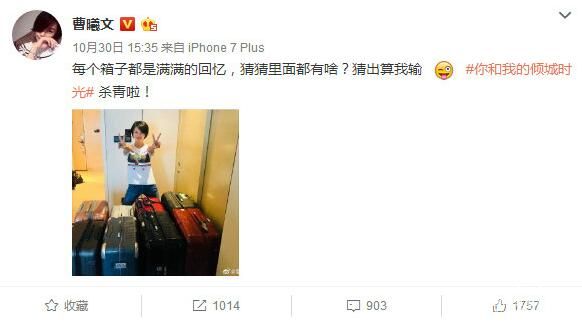 10月30日,演員曹曦文在自己微博里曬出一張與“行李箱們”合影的照片,并附言“每個箱子都是滿滿的回憶,猜猜里面都有啥?猜出算我輸”,有網友指出,箱子中皆為曹曦文進組時自帶的服飾,可見裝備多到簡直“令人發(fā)指”,感覺即將到來的雙11血拼大戰(zhàn)已經提前上演。