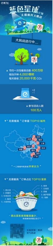 目前,選擇“無需餐具”訂單最多的用戶是來自三亞的陳小姐,20天共完成了61份環(huán)保訂單。陳小姐是一家公司的白領(lǐng),平時工作忙,平均每天都要點3次外賣。有點潔癖的她平時就會在辦公室自備筷子,她說,“一次性餐具既不環(huán)保也不衛(wèi)生,而且我經(jīng)常會點下午茶、水果,不需要用到餐具,能節(jié)約一點也是好的!”另外,“無需餐具”訂單排名前十的用戶則來自南昌、大連、成都、蘇州、杭州、深圳、武漢、上海等地。