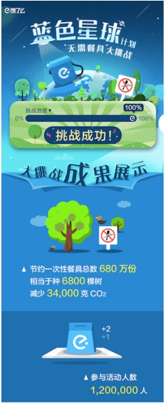 大家還記得餓了么“環(huán)保挑戰(zhàn)賽”活動嗎?只要你在下單時選擇“無需餐具”,當次數(shù)累計達到500萬次時,餓了么就會為你種樹。11月14日,餓了么公布了“環(huán)保挑戰(zhàn)賽”的活動結果:從10月10日到11月10日,平臺累計節(jié)約一次性餐具總數(shù)已超過680萬份,參與活動人數(shù)也達到120萬。按照原定每1000次=1棵樹的計劃,餓了么將種植6800棵樹木,相當于減少了34000克二氧化碳的排放。