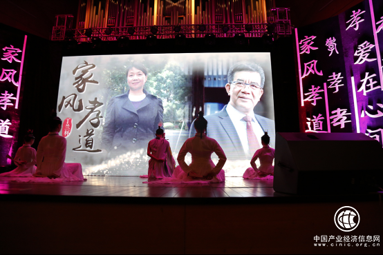 晚會(huì)舞臺(tái)背景出現(xiàn)“丁蘭十大孝星”之一:綠康醫(yī)養(yǎng)集團(tuán)董事長卓永岳的形象(右)