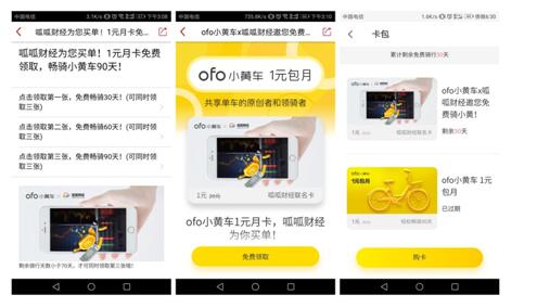 呱呱財經(jīng)官方工作人員演示了月卡的領(lǐng)取步驟:活動期間登錄呱呱財經(jīng)app,首頁設(shè)有ofo聯(lián)名月卡活動入口,點擊進入領(lǐng)取頁面,只要剩余騎行天數(shù)小于70天,按照要求輸入手機號碼,即可依次領(lǐng)取3張聯(lián)名月卡。隨后用手機號碼登錄ofo官方APP,在“個人中心”-“我的錢包”-“卡包”菜單下可查看該月卡使用詳情。