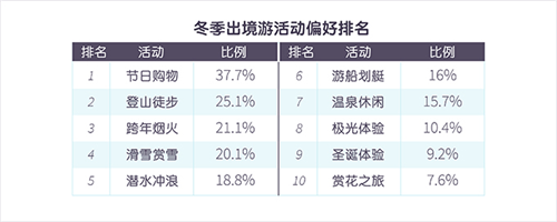 從冬季出境游項(xiàng)目整體來(lái)看,年底出境購(gòu)物依舊是冬季出行的主要活動(dòng)之一,占據(jù)整體活動(dòng)的37.7%,國(guó)外各大商場(chǎng)和品牌的重磅圣誕折扣和年終促銷(xiāo)對(duì)國(guó)內(nèi)游客依舊具有極大吸引力。同樣值得注意的是登山徒步活動(dòng)排名僅次于購(gòu)物,占整體游客喜愛(ài)活動(dòng)的25%;具有節(jié)日特色體驗(yàn)的跨年煙火和滑雪賞雪活動(dòng)也是冬季出游熱門(mén)項(xiàng)目,分別占比21%和20%。除了滑雪和賞雪,滑冰、體驗(yàn)極地摩托和雪地摩托、看冰雕雪雕也是越來(lái)越受游客喜愛(ài)的出境游活動(dòng)。