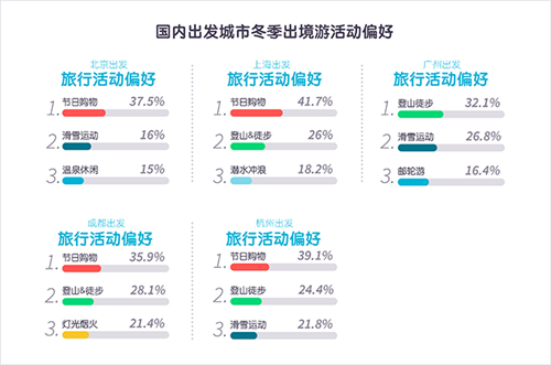 從國(guó)內(nèi)重點(diǎn)一、二線城市在冬季出行趨勢(shì)的表現(xiàn)來(lái)看,年底節(jié)日購(gòu)物依舊是重點(diǎn)城市冬季出境游剛需,依舊占據(jù)大多城市旅行活動(dòng)榜首,該項(xiàng)活動(dòng)在上海游客中占比最高,達(dá)到近42%;相對(duì)其它城市,北京游客更喜愛(ài)冬季出境泡溫泉,這一占比達(dá)到15%;而越來(lái)越火爆的郵輪游則備受廣州游客歡迎,有16.4%的廣州出境游愛(ài)好者有計(jì)劃在冬季乘坐郵輪出游;還有21.4%的成都游客對(duì)燈光節(jié)、跨年煙火和燈展表現(xiàn)出極大興趣。除北京外,廣州和杭州等極少見(jiàn)到大雪的南方城市對(duì)冬季出境滑雪更加充滿(mǎn)期待。