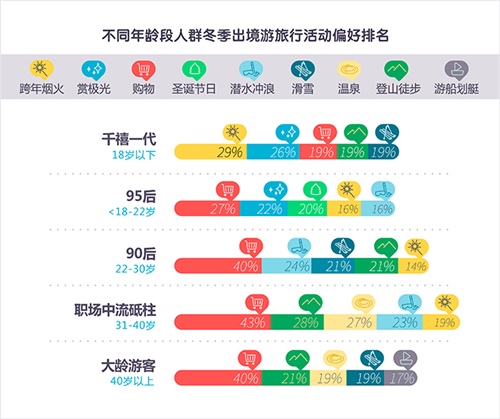從不同年齡段人群冬季出境游活動(dòng)偏好情況來(lái)看,千禧一代由于大多由父母陪同出游,在眾多旅行項(xiàng)目中,跨年煙火和賞極光成為兩大熱門(mén),分別占比29%和25.8%;相對(duì)更具自主選擇權(quán)的95后大學(xué)生群體以及22-30歲出境游愛(ài)好者除了在購(gòu)物實(shí)力方面不容小覷之外,各種形式的體驗(yàn)游才是他們出行的真正目的,極光、圣誕、跨年和潛水沖浪都是他們的出行關(guān)鍵詞,敢想會(huì)玩兒的他們展示出了年輕一代的旅行理念;而31歲以上的游客,也是如今的職場(chǎng)中流砥柱和較為成熟的旅客,則更加偏好登山徒步和溫泉旅行等相對(duì)溫和的旅行方式。