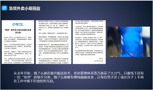 類(lèi)似的還有一個(gè)關(guān)于急哭外賣(mài)小哥的回應(yīng)。突然有一天網(wǎng)上瘋傳一個(gè)視頻,一個(gè)餓了么的外賣(mài)小哥,因?yàn)樗筒婉R上就要遲到,在電梯里急得大哭。大家一方面同情小哥,另一方面覺(jué)得平臺(tái)是不是有管理失誤的地方。我們也對(duì)此作了回應(yīng)。