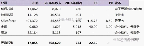我們把天海投資的定位對(duì)標(biāo)IT分銷公司、云服務(wù)公司,其中salesforce在美國(guó)上市,科通芯城和金蝶在香港上市,其余在A股市場(chǎng)。